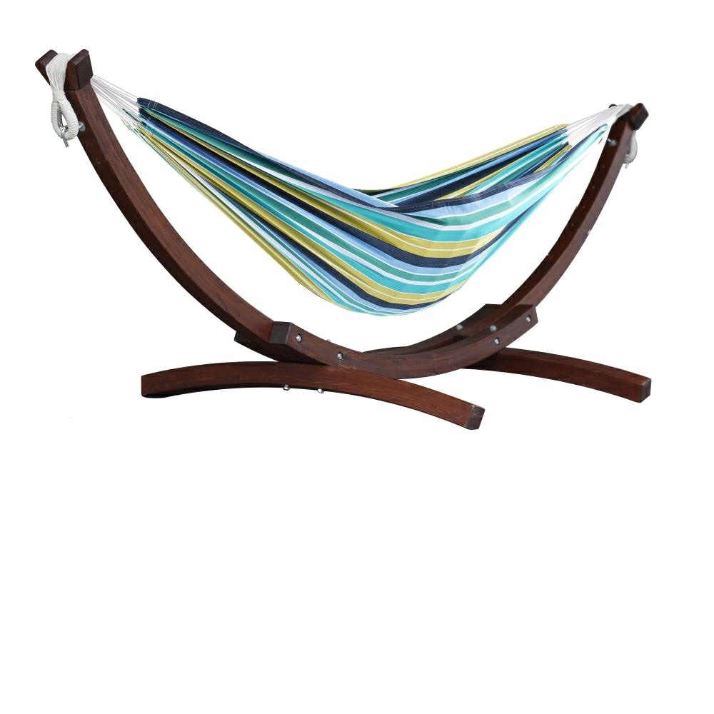 Das Bogengestell ist aus FSC-zertifiziertem Massivkiefernholz gefertigt, was nicht nur für Stabilität, sondern auch für Nachhaltigkeit steht. Die Baumwollhängematte bietet mit einer maximalen Belastbarkeit von 205 kg ausreichend Platz für zwei Personen, um gemeinsam zu relaxen und die Natur zu genießen.